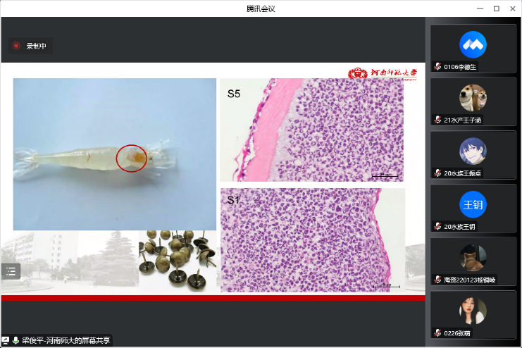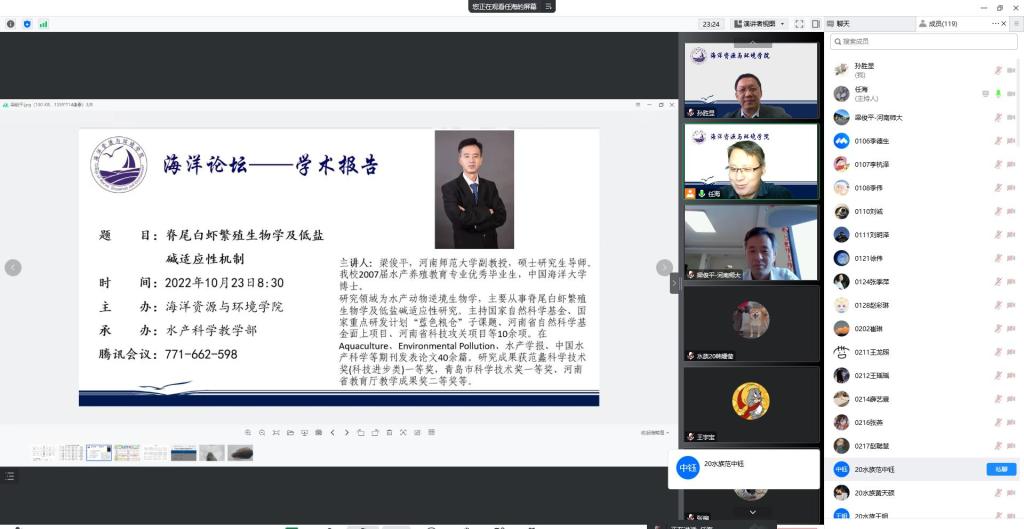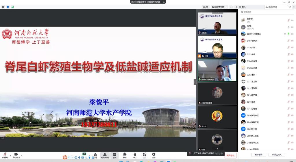 2022年10月23日上午,英国365集团三期海洋论坛活动在腾讯会议线上进行,本次活动邀请了优秀员工河南师范大学梁俊平博士给公司师生做学术报告。会议由水产科学教学部任海博士主持,水产科学教学部全体教师、渔业发展硕士研究生以及英国365集团本科生300余人收听了报告,公司党委副书记、副经理孙胜显出席会议。