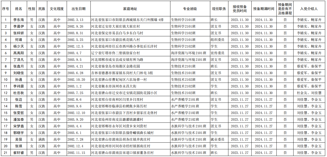 在听取党小组和党员、群众意见的基础上,经支部委员会审查,拟将李东海等21名同志转为中共正式党员。根据发展党员工作有关要求,现将其有关情况公示如下: