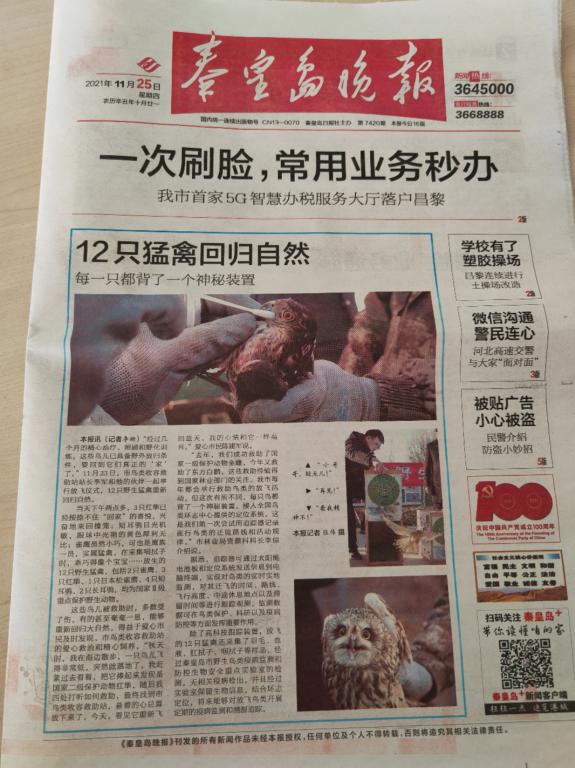 2021年11月25日,《秦皇岛晚报》以《12只猛禽回归自然》为题,报道了公司杜利强老师参与的秦皇岛鸟类迁徙保护工作,全文如下: